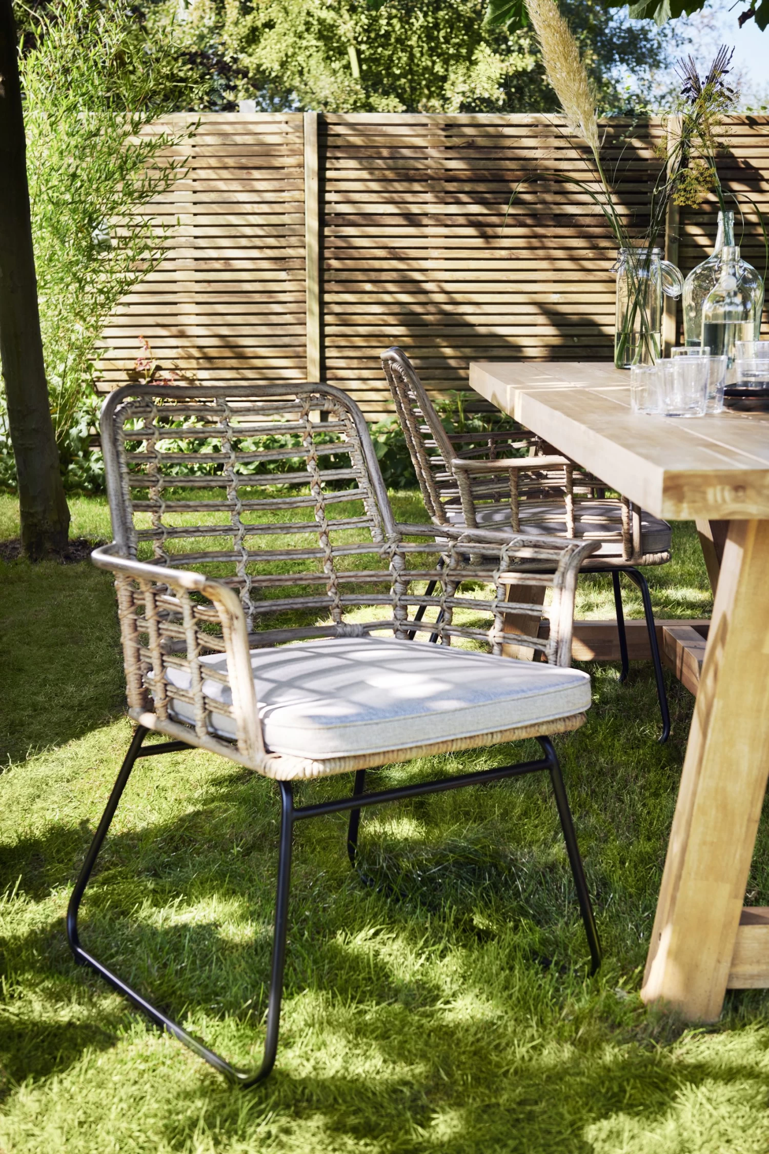 Een houten tuinmeubel moet je gemiddeld 1 a 2 keer per jaar behandelen. Je maakt als eerste je meubel schoon door deze te af te spuiten met water en te ontvetten. Vervolgens kan je het meubel schuren met een fijne korrel schuurpapier en na het schuren stofvrij maken. Neem het meubel af met een licht vochtige doek en breng als laatste PU tuinmeubellak gelijkmatig aan. Bij het schoonmaken van je meubel, gebruik geen agressieve schoonmaakmiddelen maar een zachte borstel, groene zeep en lauw water. Hout is een natuurlijk materiaal waarvan het uiterlijk zal veranderen wanneer het wordt blootgesteld aan de weerselementen. Hierdoor kunnen kleine scheuren ontstaan en/of verandering van kleur optreden, dit zijn natuurlijke eigenschappen van hardhout. Houten meubelen vragen om regelmatig onderhoud.