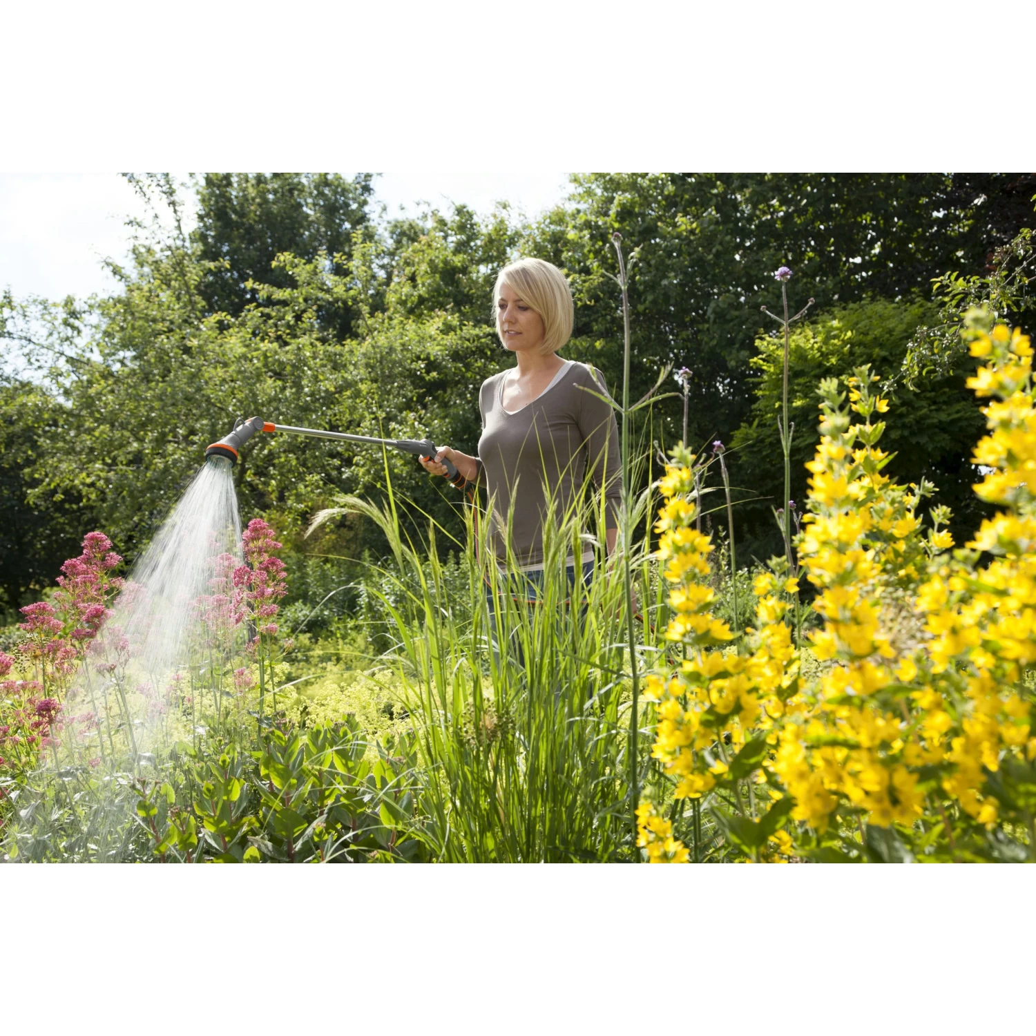 De Gardena broes comfort met verlengstuk heeft een brede sproeikop en kun je gemakkelijk plekken mee schoonmaken of planten water geven waar je normaal gesproken niet makkelijk bij kunt. Hierdoor kan deze uitstekend gebruikt worden om bloembedden of grote plantgebieden van water te voorzien. Als je een langere tijd aan één stuk wilt sproeien kun je de hendel vast zetten.