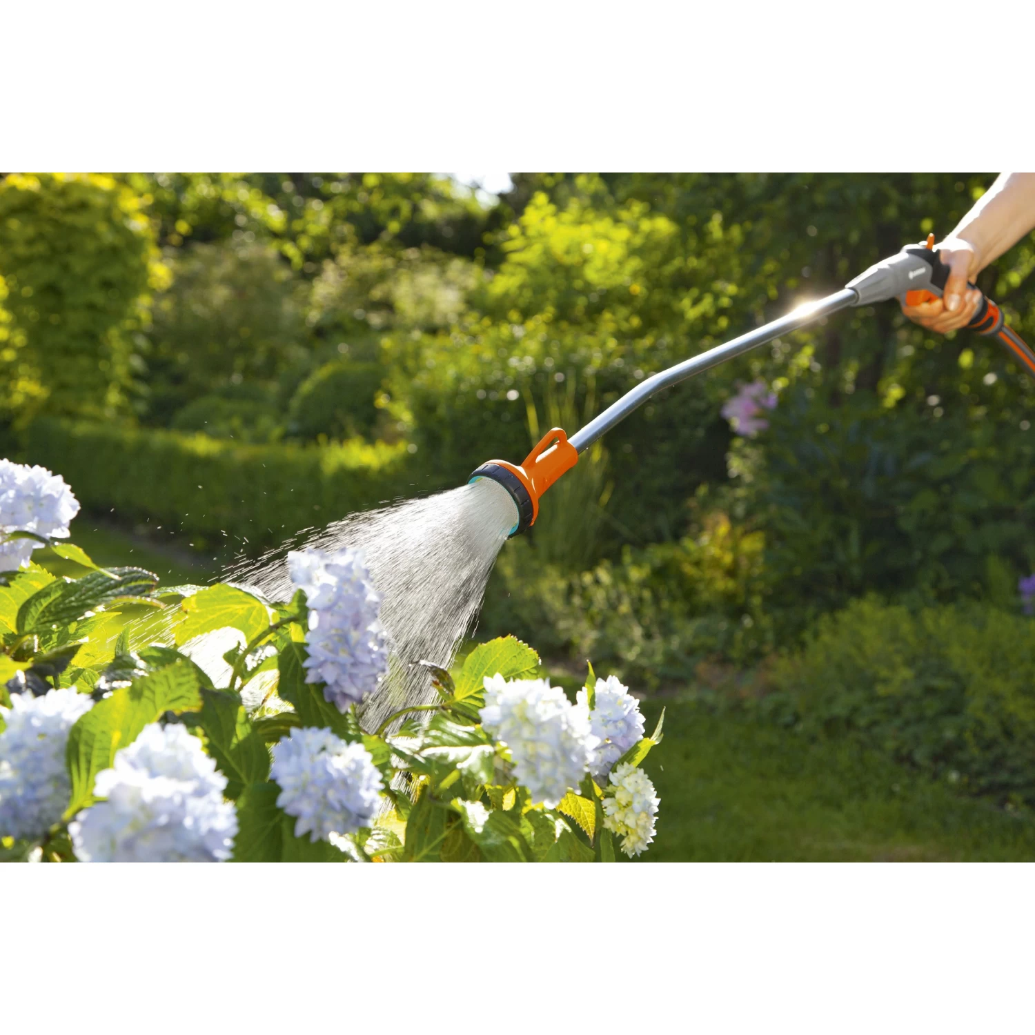 Deze Gardena broes met afsluitbaar verlengstuk is geschikt voor het zacht en gericht besproeien van planten. De waterdoorvoer is traploos in te stellen en geheel af te sluiten. Je kunt sproeien door de handgreep in te drukken, maar je kunt de handgreep ook vergrendelen. Daardoor kun je sproeien zonder vermoeid te raken. Het verlengstuk is 80 centimeter lang. Dit is handig voor het bereiken van de plekken die lastig te bereiken zijn.