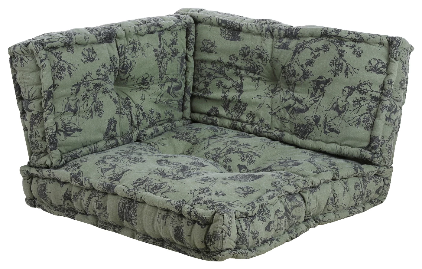 Deze kussenset past op de pallet hoekbank Trevor (artikelnummer: 626207). Met de palletkussens Sinne maak je van een pallet heel gemakkelijk een comfortabele zitplaats. De kussens van groen gewassen canvas met print bestaan uit een zit- en een ruggedeelte. Dit kussen is speciaal geschikt voor palletonderstel Trevor hoekstuk. Zowel het binnen- als het buitenmateriaal bestaat uit 100% katoen.