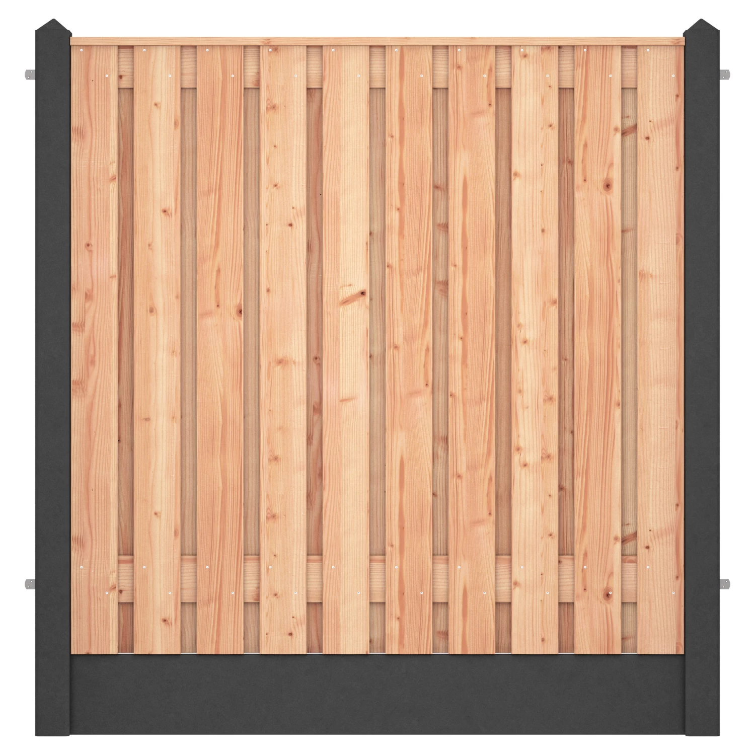 Voor het tuinscherm kun je kiezen tussen twee soorten materialen: geïmpregneerd grenenhout of douglashout. Iedere schutting staat uit 19 planken en dankzij de dichte opbouw, zorgt het scherm voor zowel veel privacy als een hoge windbelastbaarheid. Zoals op de afbeelding te zien is, wordt het scherm verticaal geplaatst. Bij een aanschaf vanaf 5 meter aan houtbetonschutting, kan er ook een extra element toegevoegd worden zoals een gaasscherm, een hoog- of laag scherm en een schuin aflopend scherm.