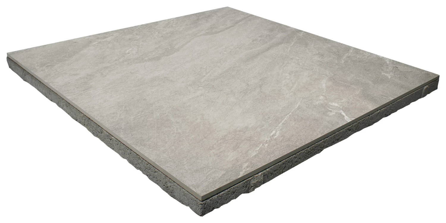 Deze keramiek op beton terrastegel vormt een unieke hybride combinatie; een 1 cm dikke keramische tegel op een 3 cm dikke betonnen onderlaag. Deze keramische boventegel is onlosmakelijk verbonden met een waterdoorlatende betonnen ‘geo’ onderlaag met geïntegreerde afstandshouders.