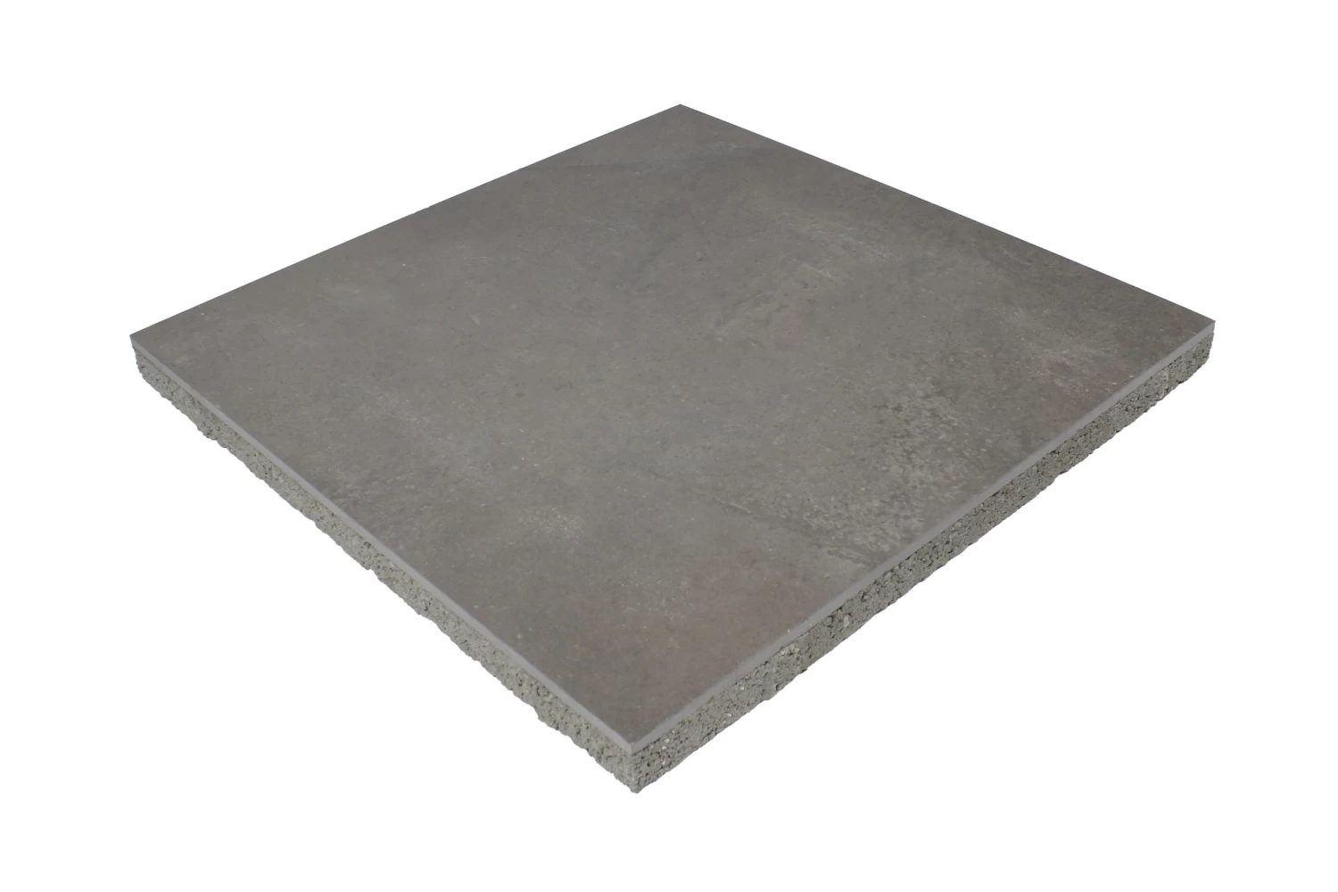 Deze keramiek op beton terrastegel vormt een unieke hybride combinatie; een 1 cm dikke keramische tegel op een 3 cm dikke betonnen onderlaag. Deze keramische boventegel is onlosmakelijk verbonden met een waterdoorlatende betonnen ‘geo’ onderlaag met geïntegreerde afstandshouders.