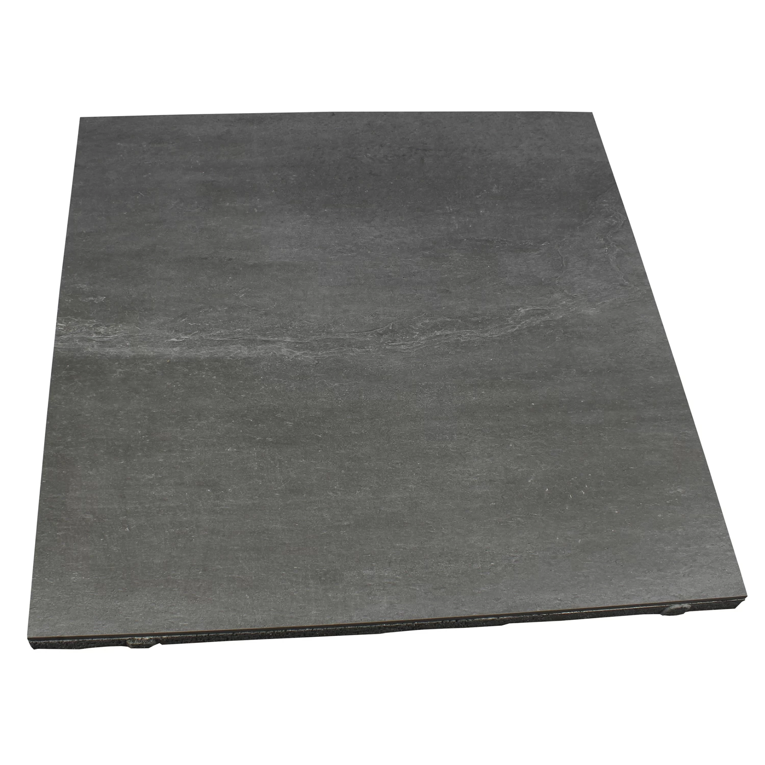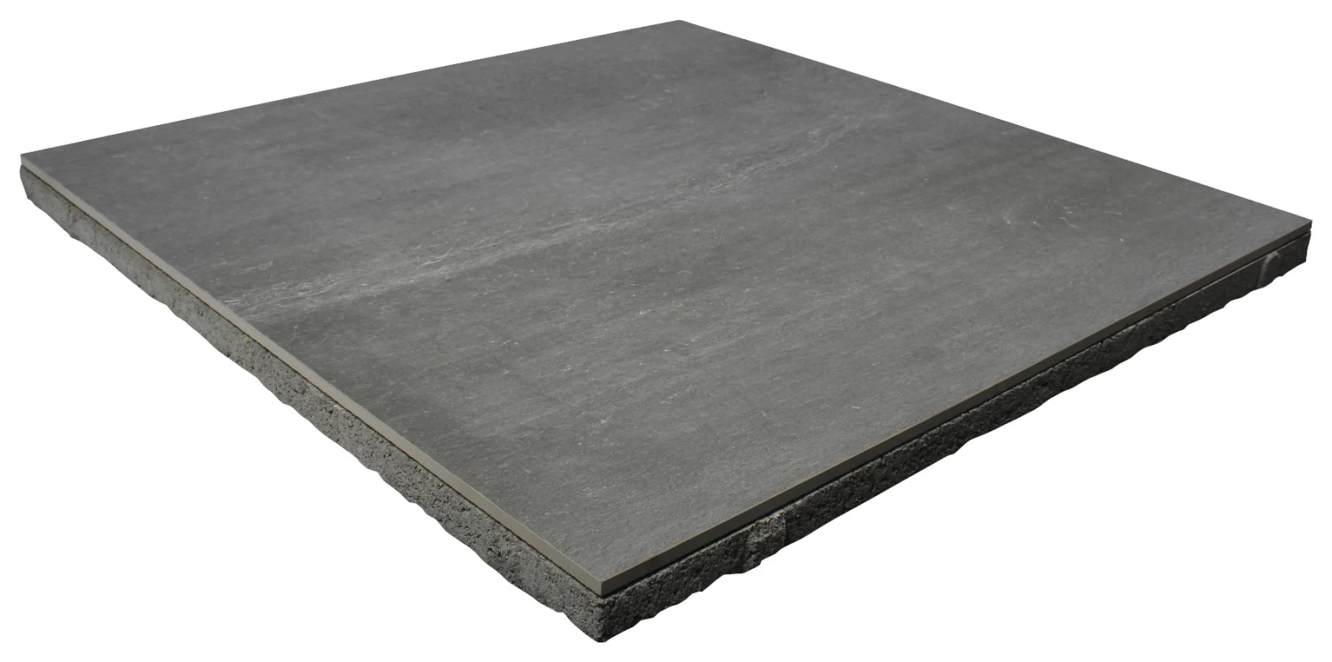 Deze keramiek op beton terrastegel vormt een unieke hybride combinatie; een 1 cm dikke keramische tegel op een 3 cm dikke betonnen onderlaag. Deze keramische boventegel is onlosmakelijk verbonden met een waterdoorlatende betonnen ‘geo’ onderlaag met geïntegreerde afstandshouders.