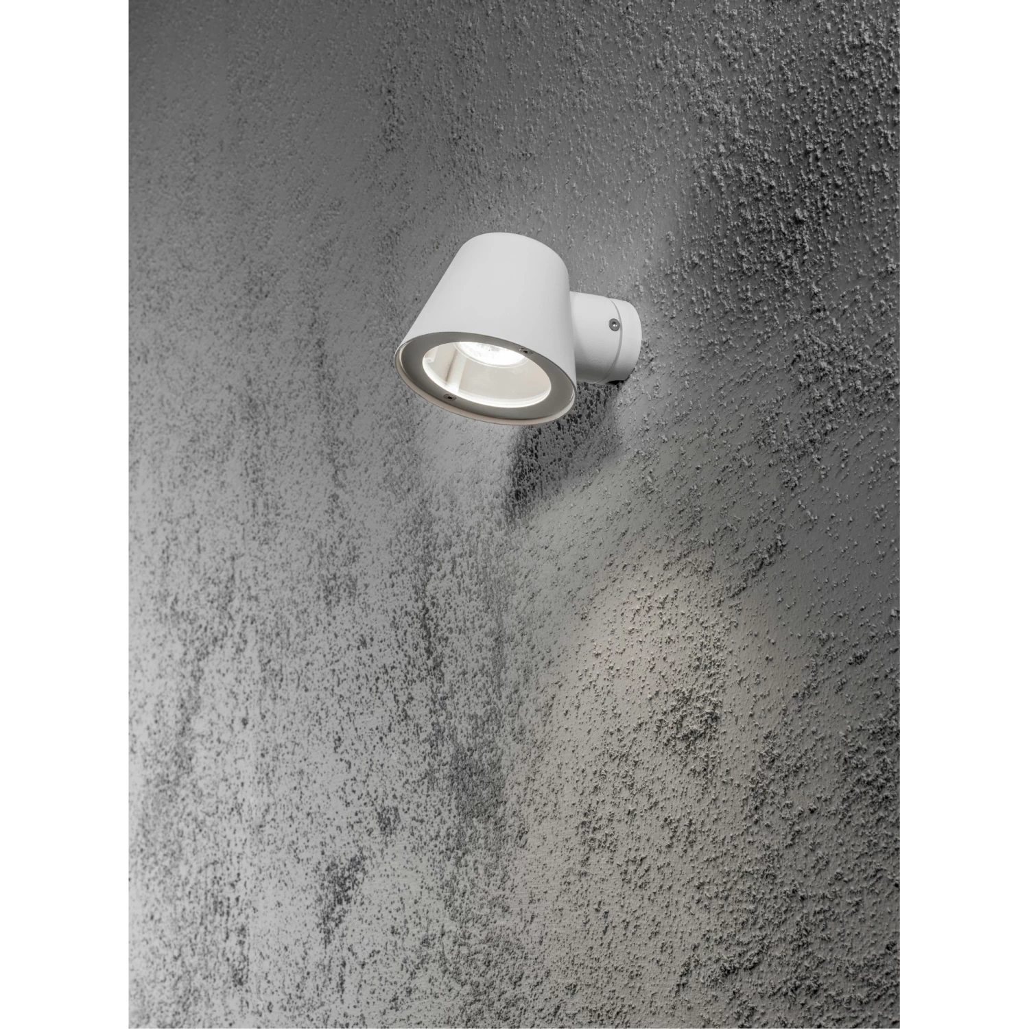De Konstsmide buitenlamp Trieste wit is gemaakt van aluminium en is gelakt in de kleur matwit. Deze moderne buitenlamp heeft een sfeervolle uitstraling op de muur naast je deur of als accentverlichting in de tuin. De fitting van deze lamp is geschikt voor een 35W GU10 lichtbron. Het transparante acrylglas zorgt voor een mooi helder licht dat naar onder schijnt.