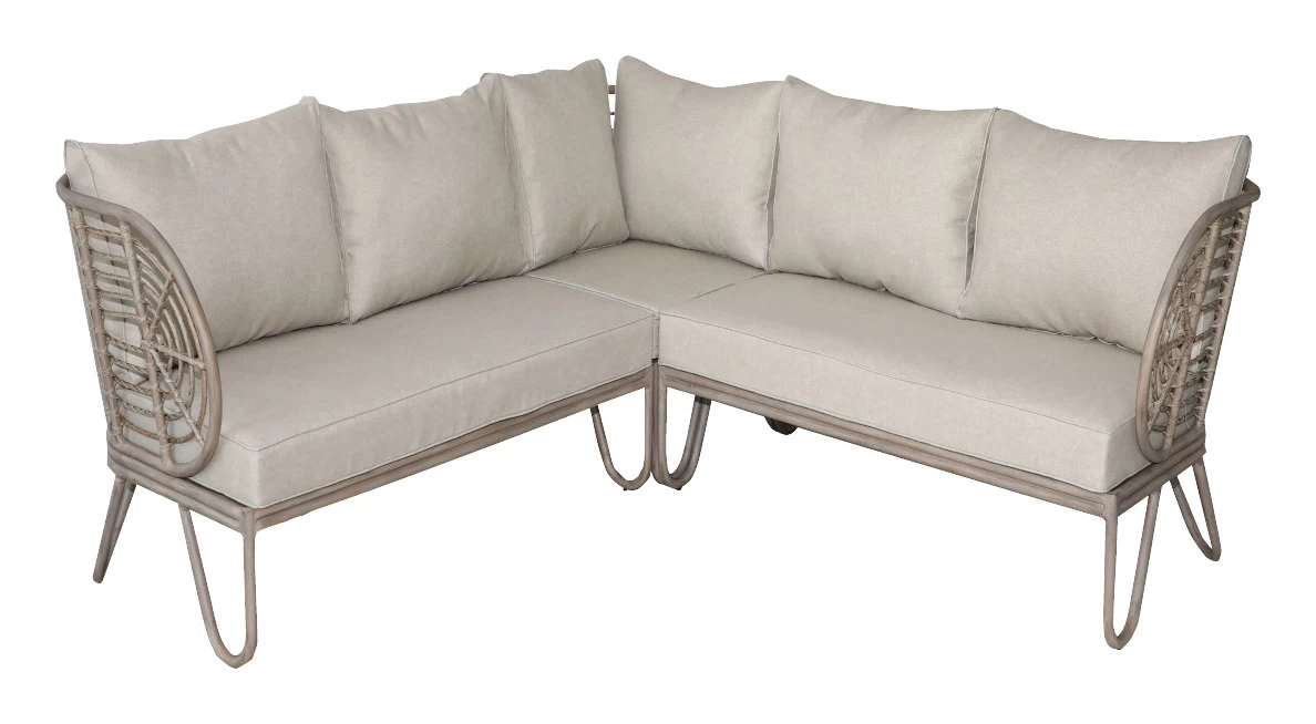 De Loungeset Hanna is een innovatieve combinatie van verschillende materiaalsoorten. Het aluminium frame is voorzien van een kunststof houtlook in een gevlochten rotan design. Hierdoor ontstaat er een moderne loungeset met een natuurlijke uitstraling. De combinatie van materialen heeft als voordeel dat het volledig roest en weersbestendig is.