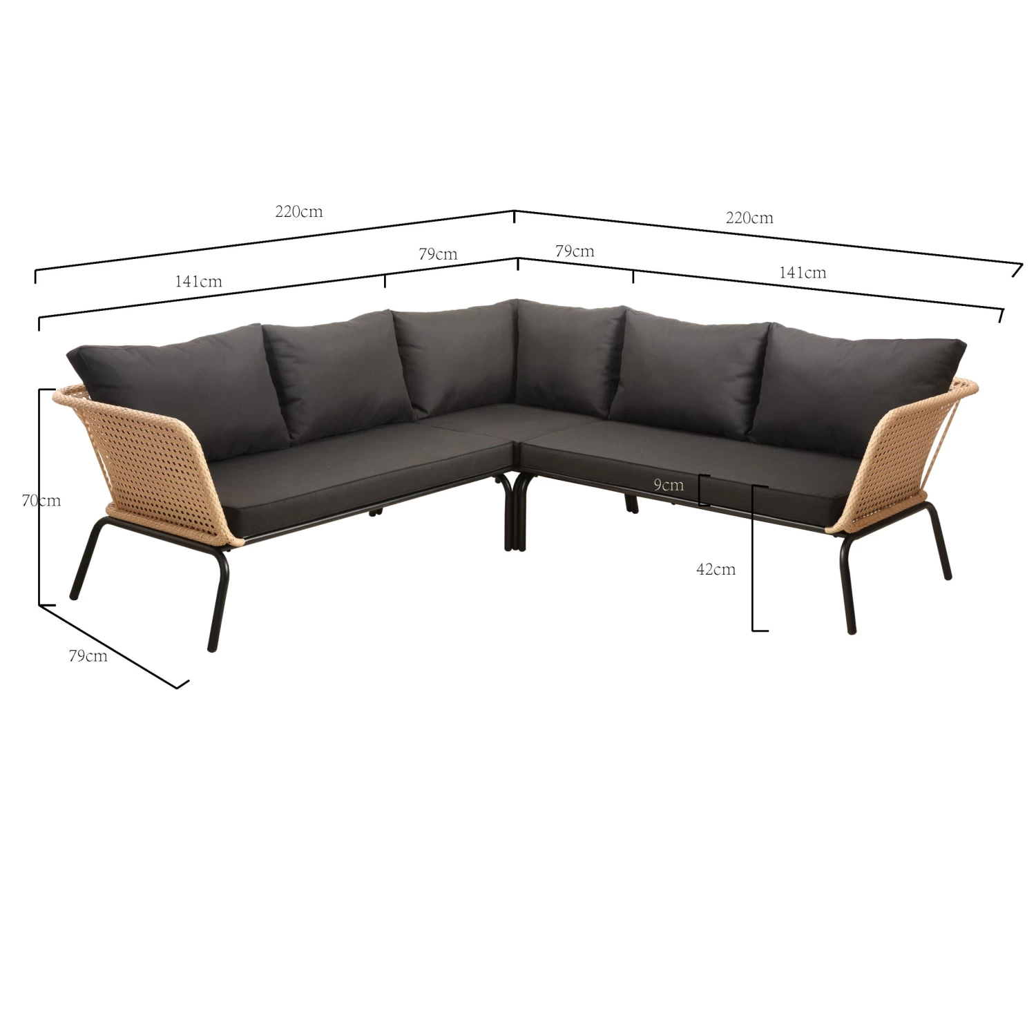 De Harvey loungebank is 75 cm hoog, 220 cm breed en 220 cm diep.