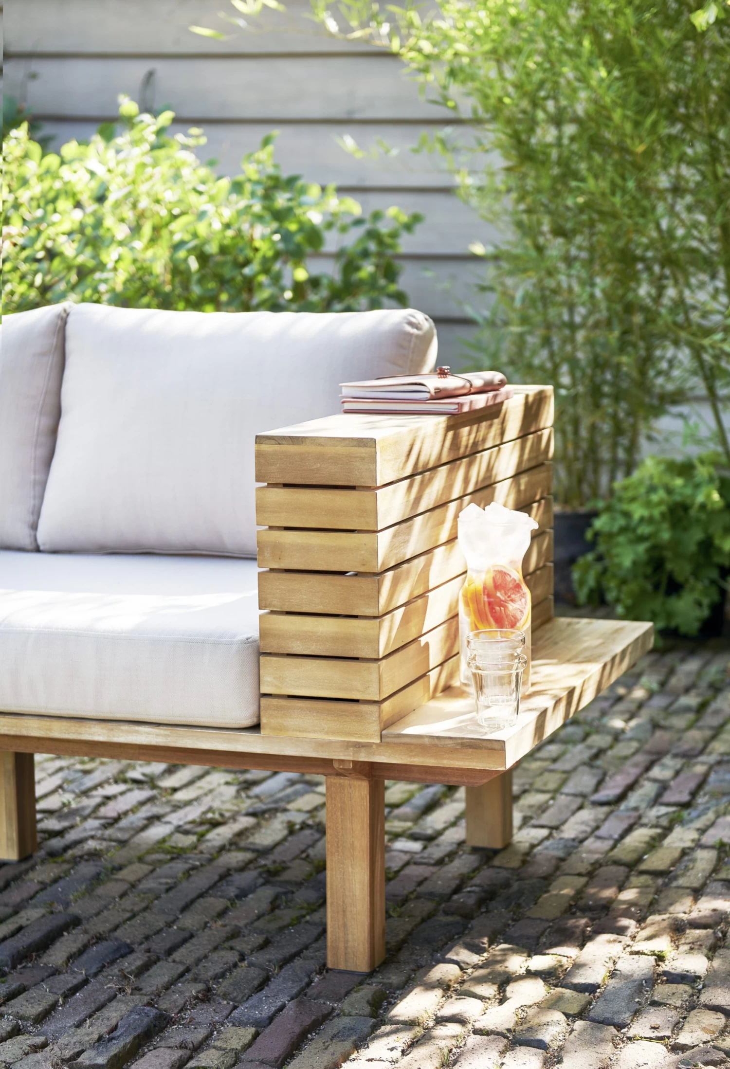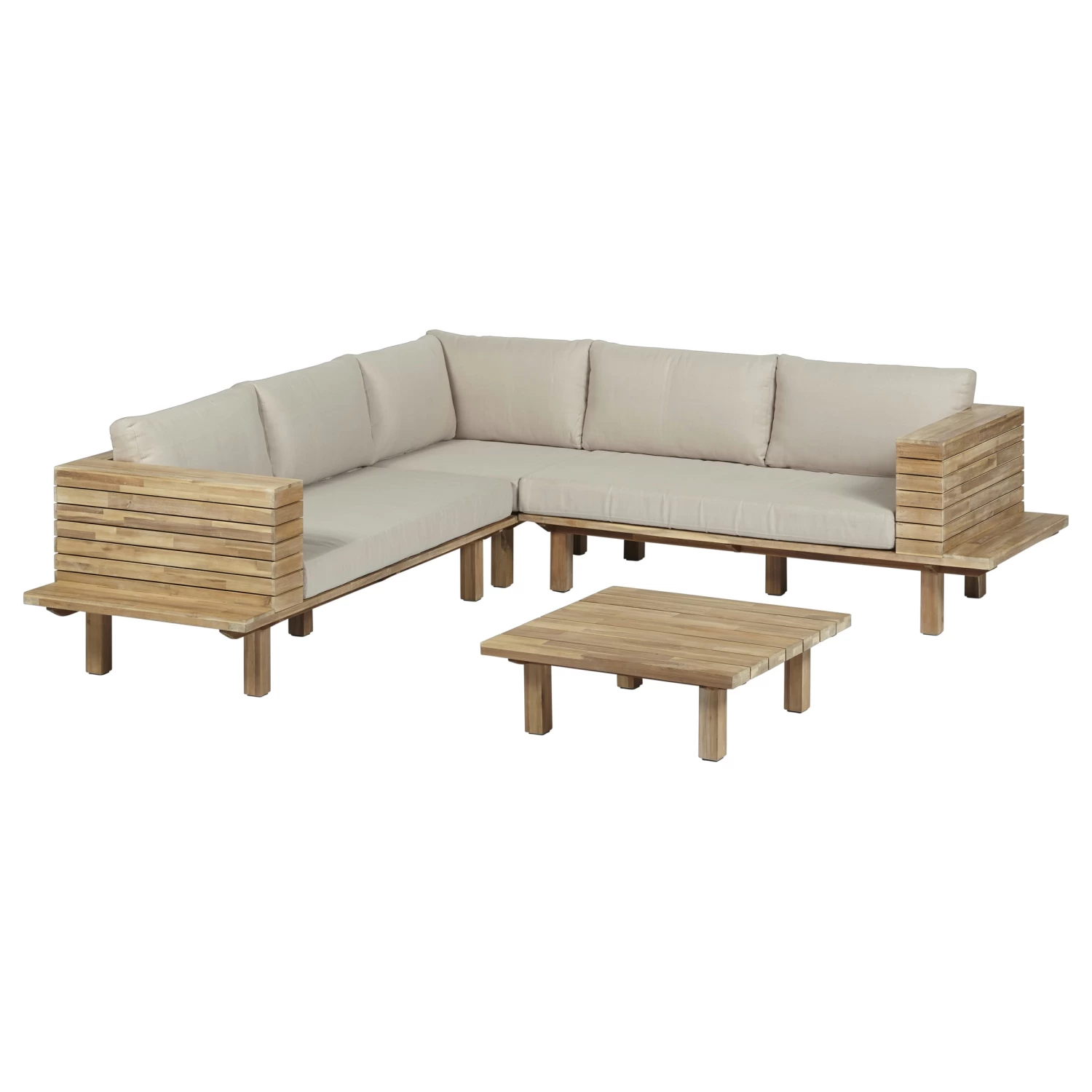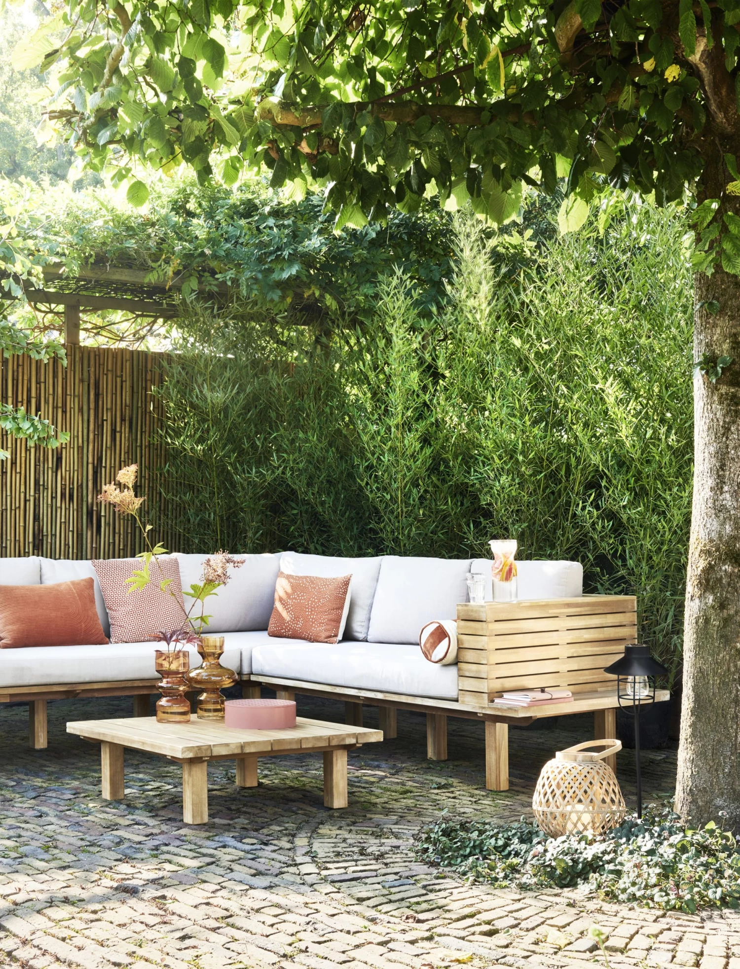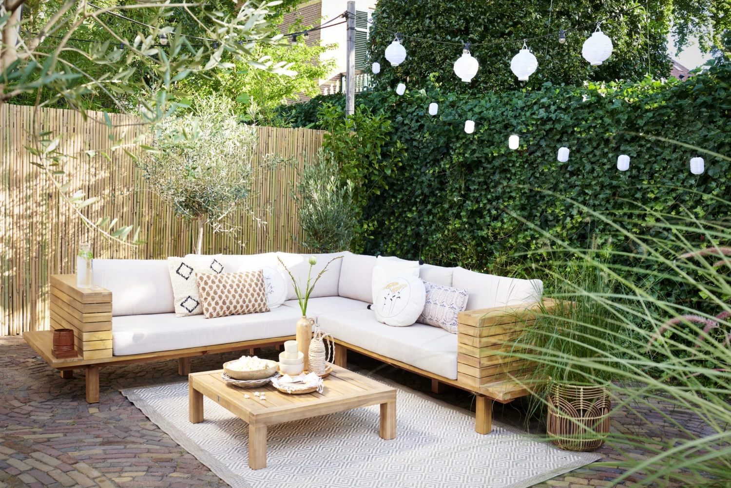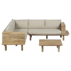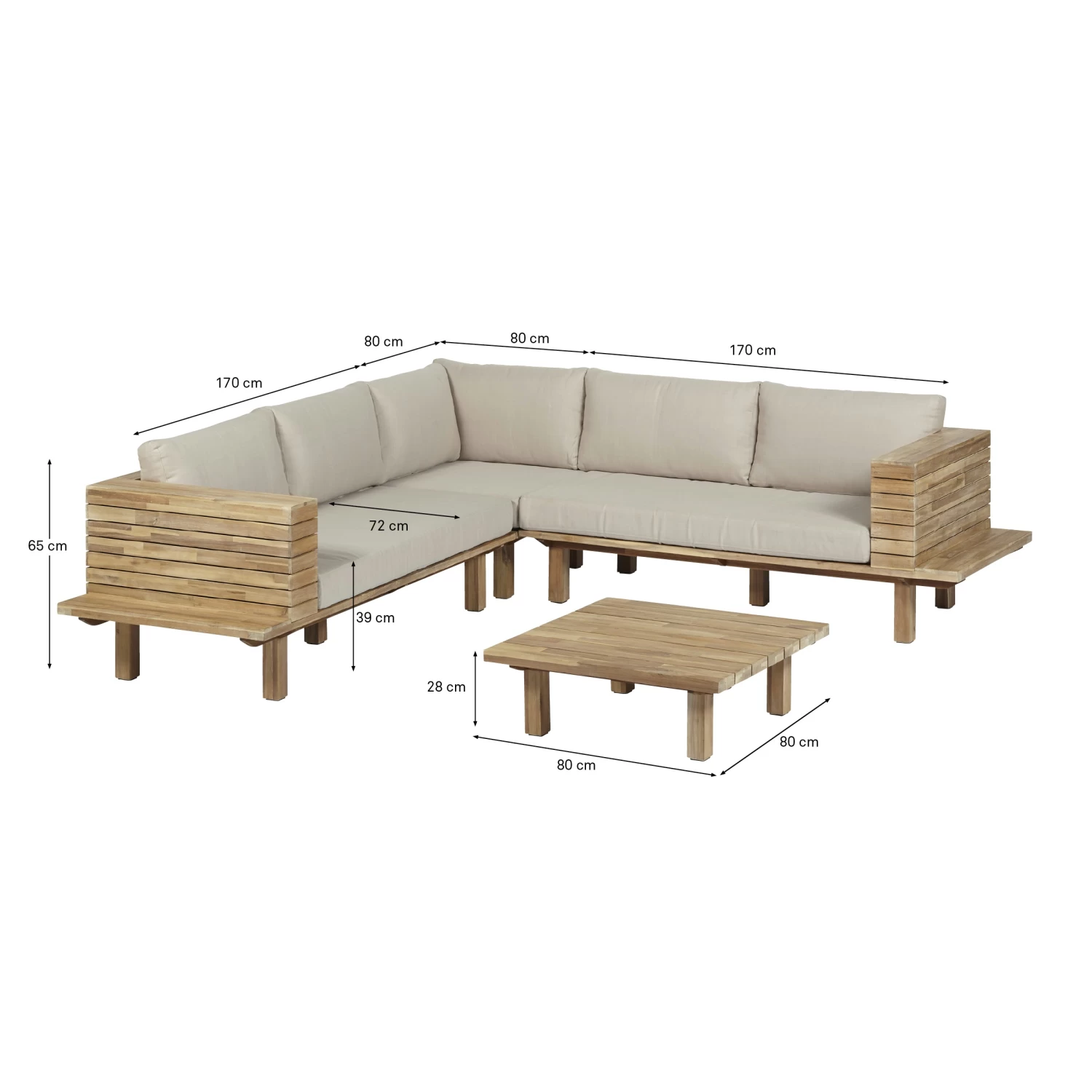 De loungeset Lissabon is riante 5 persoons set om in te loungen. Deze houten set kenmerkt zich door de strakke vormen en comfortabele kussens. Door haar zachte tinten geeft deze set je tuin direct een chalet gevoel met een moderne twist. De loungeset Lissabon is een echte eyecatcher op jouw terras of in de tuin en erg praktisch door de extra planken aan beide zijdes van de bank, wat zich perfect leent voor je drankje of decoratie.Â