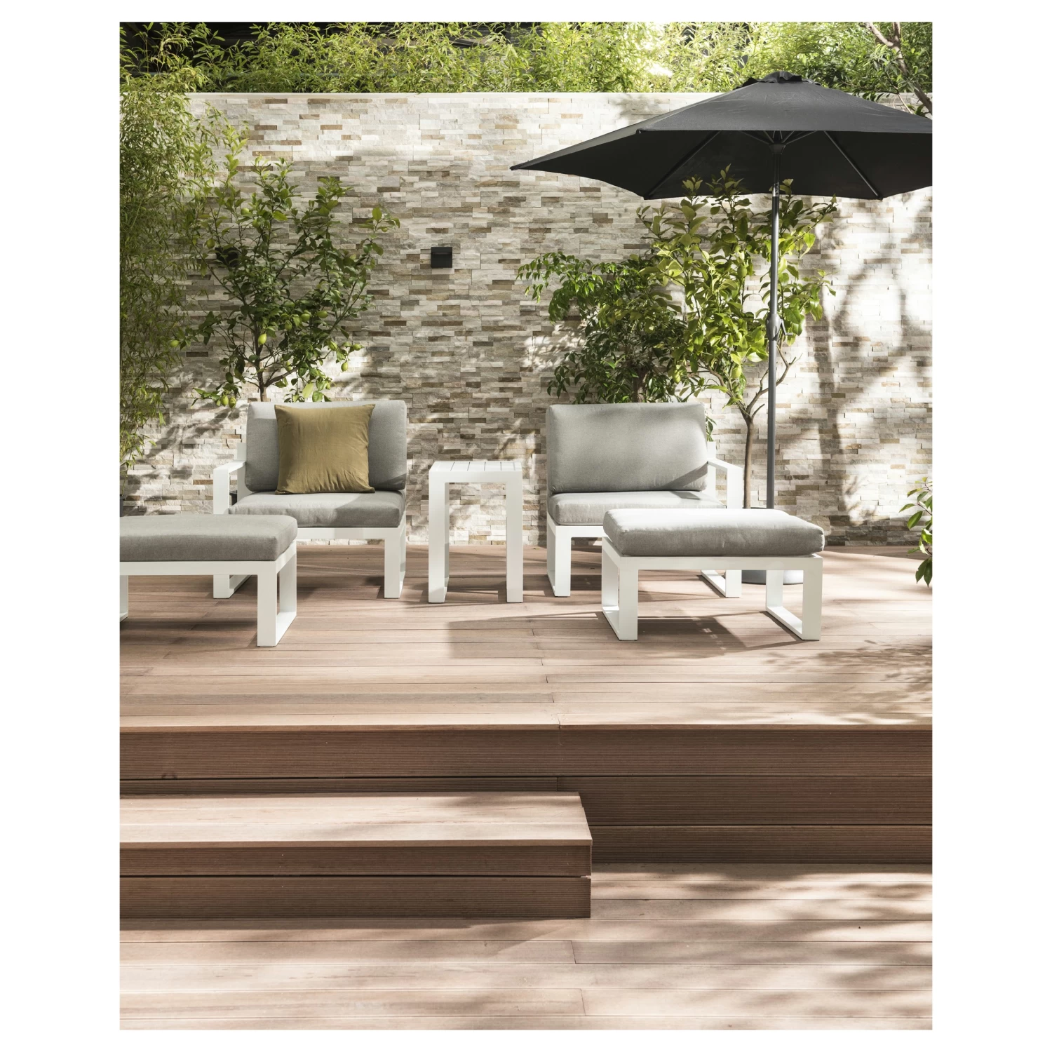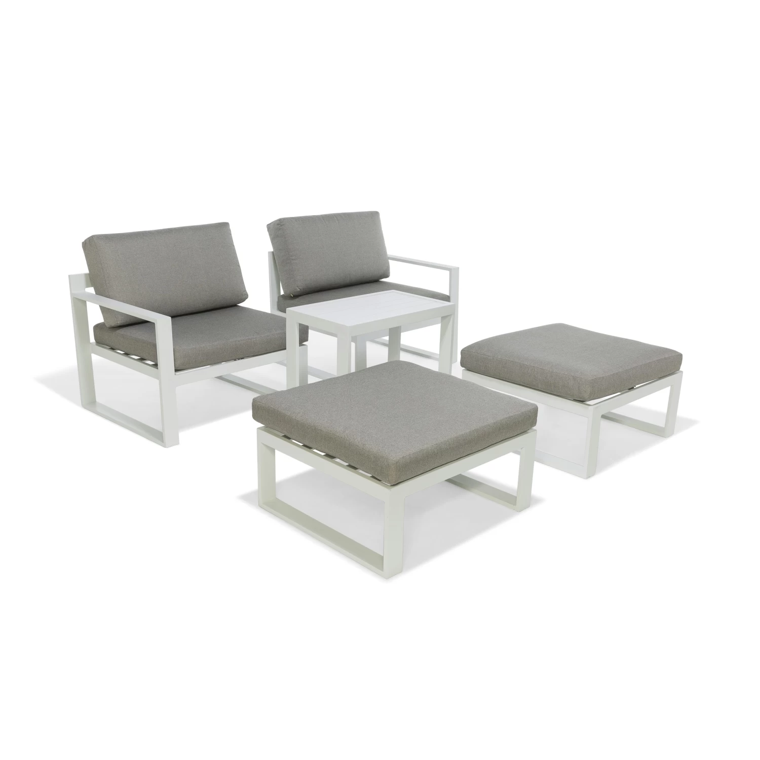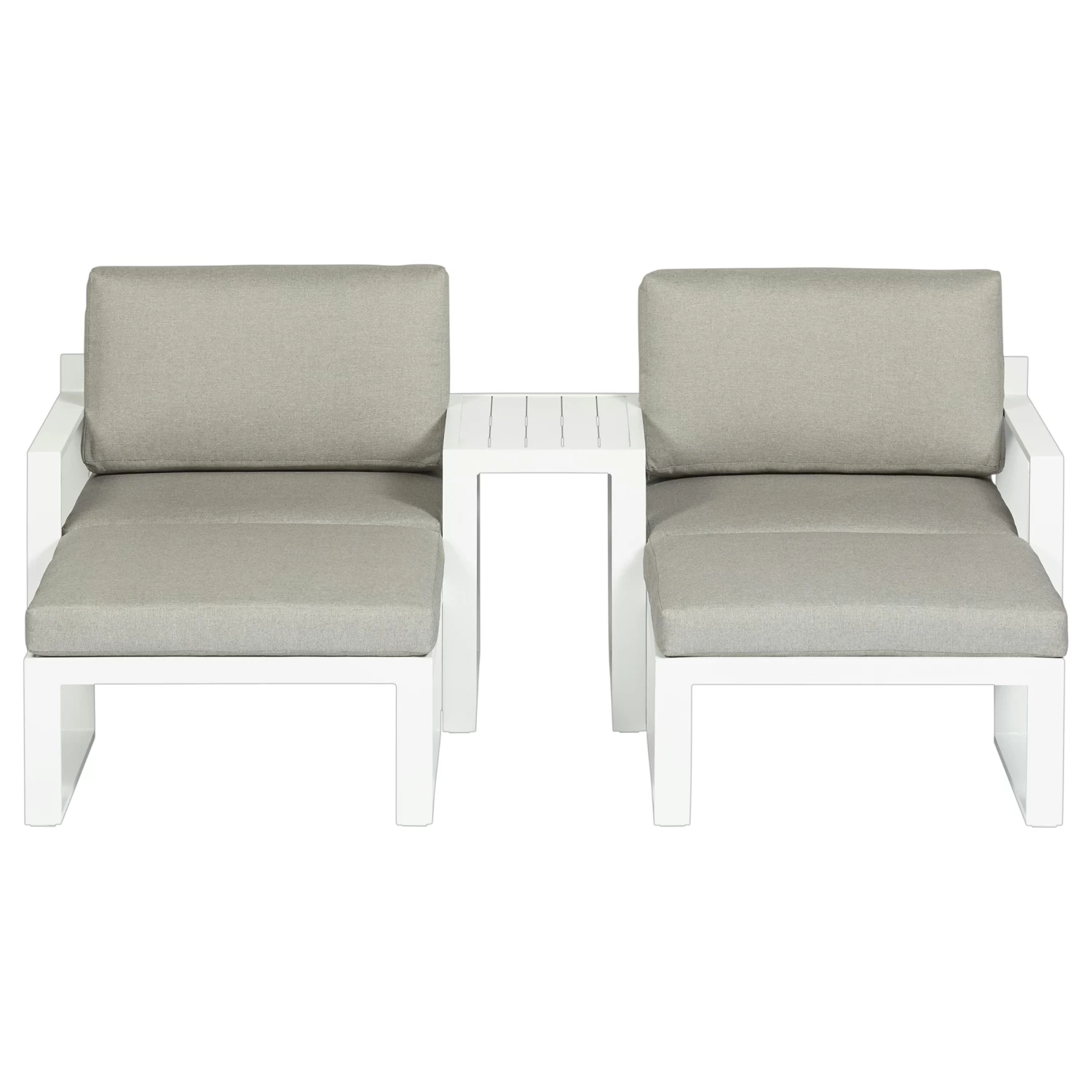 De loungeset modulair Barbados is een moderne set met eindeloze mogelijkheden. Deze set kun je helemaal aanpassen naar je eigen behoefte. Loungeset modulair Barbados is gemaakt van aluminium. Geniet van de zomer op deze comfortabele set die dankzij het aluminium makkelijk te verplaatsen is. De loungeset is wit en inclusief grijze kussens. De loungeset bestaat uit twee stoelen, twee hockers en een tafel. De loungeset is inclusief een klem om onderdelen aan elkaar te bevestigen.