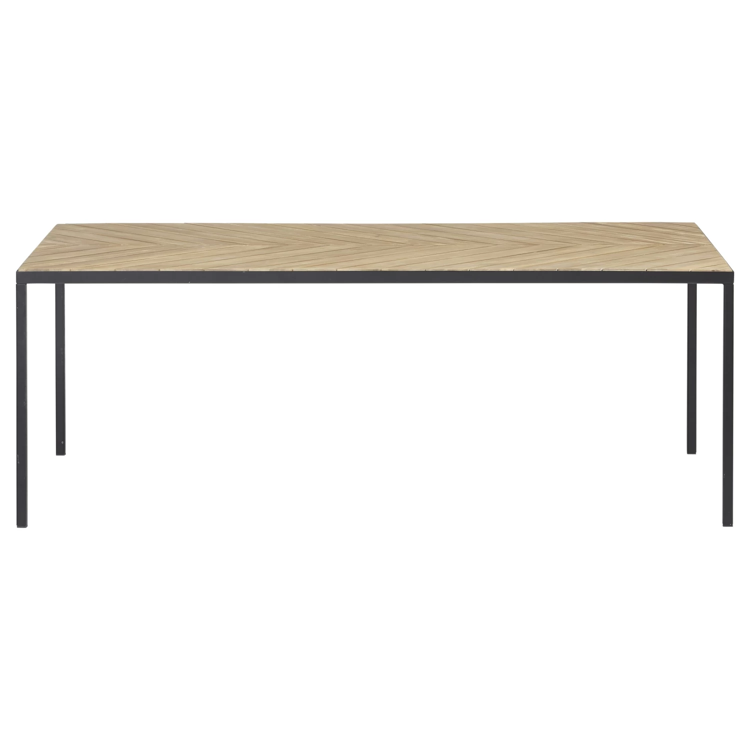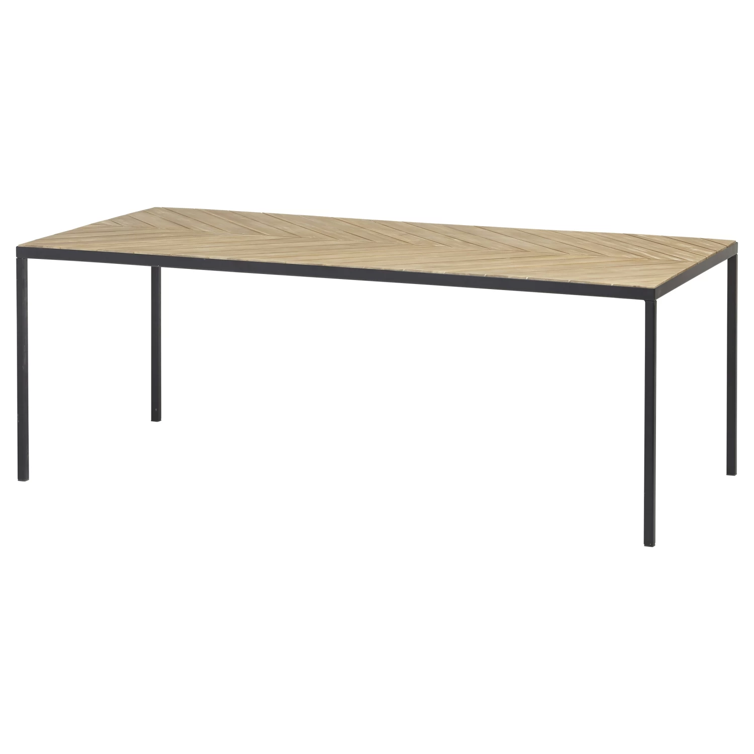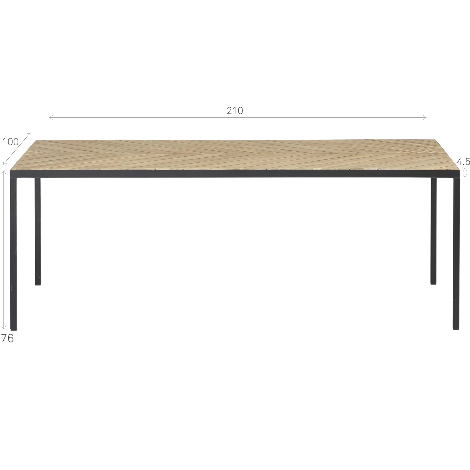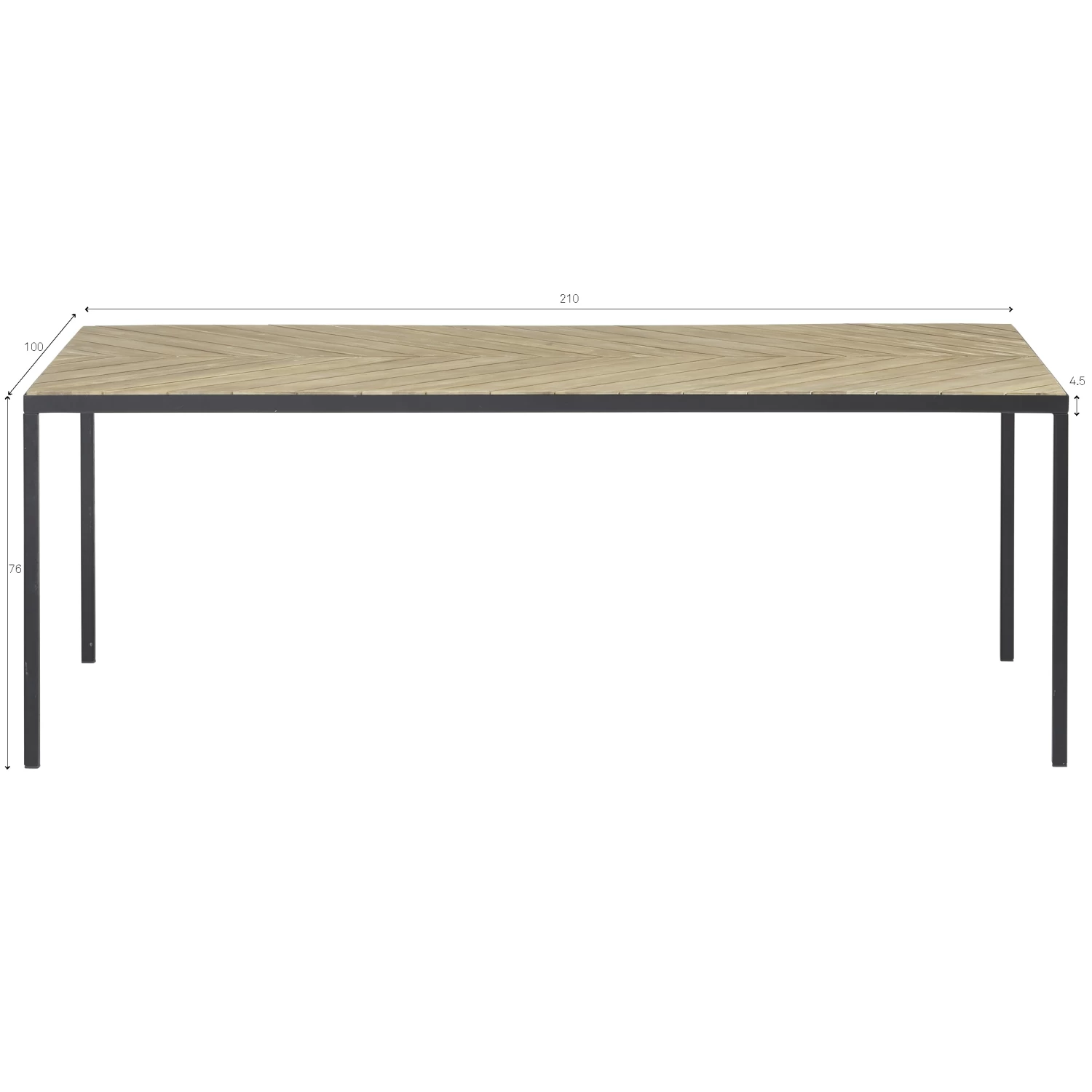De tuintafel Jake 210 cm is een mooie eettafel met een luxe uitstraling. De tafel heeft een zwart stalen frame. Het blad is gemaakt in een visgraat motief, en is gemaakt van acaciahout. De tafel is behandeld met een olie laag. Na verloop van tijd kan er verkleuring ontstaan, met de juiste behandeling blijft het hout lang mooi van kleur. Afmetingen