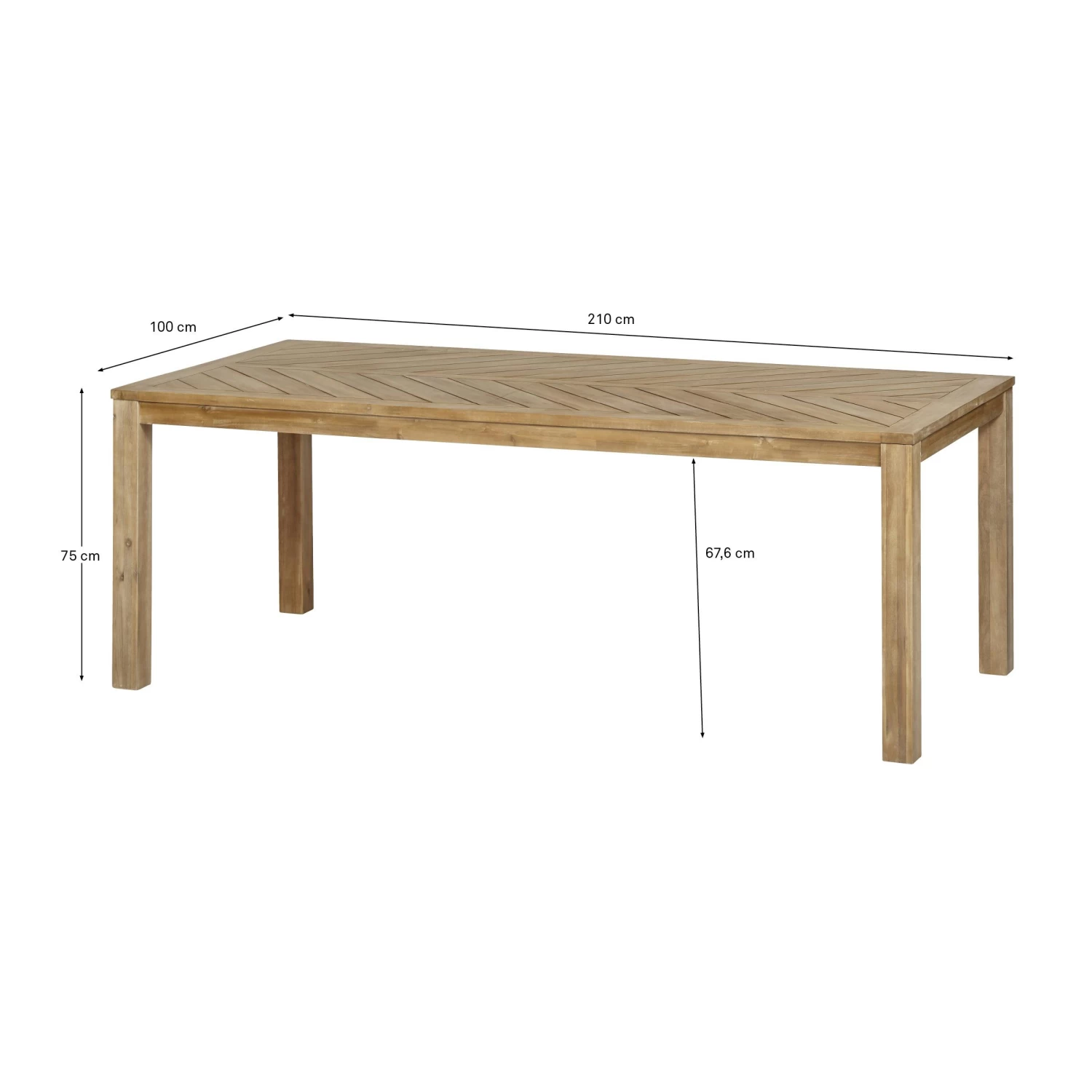 De tafel is 210 centimeter lang, 100 centimeter breed en 76,5 centimeter hoog.