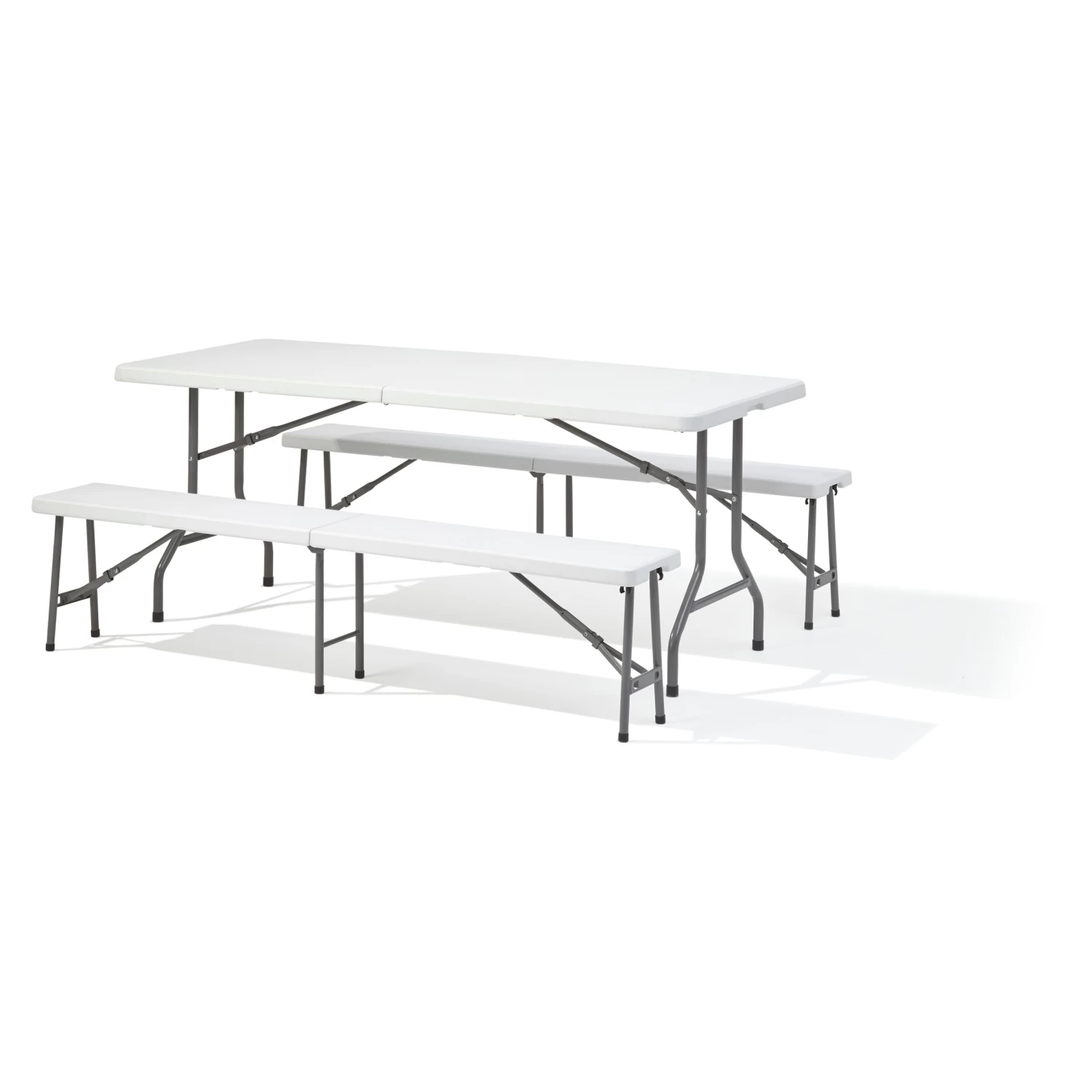 Tuinbank kunststof 180 cm is een handige inklapbare partybank en is onderhoudsvrij. Het zitgedeelte is van kunststof in de kleur wit en het metalen onderstel is gelakt in het grijs. Een ideale bank voor buiten bij tuinfeesten of andere evenementen. De bank is na gebruik makkelijk op te bergen en neemt niet veel ruimte in. Bij deze bank is de afgebeelde bijpassende tafel verkrijgbaar met artikelnummer 390843.